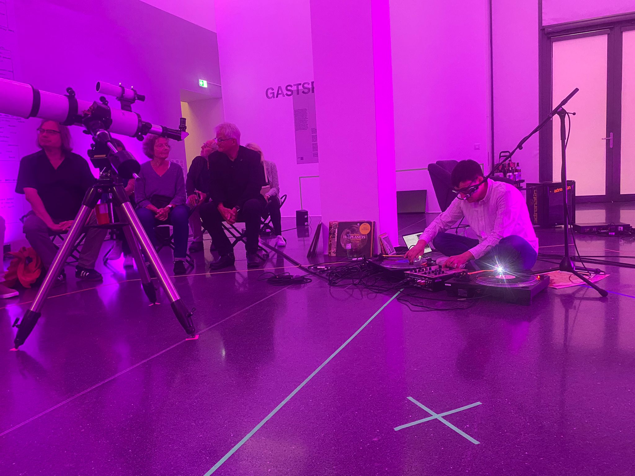 Jürgen Schmidt from the Astronomische Verein Dortmund was invited to give a talk about the possibility of projecting a film onto the Moon so that it can be viewed from Earth; as though the Moon is a cinema screen for the Earth. Schmidt had a handheld microphone and gave a talk while walking around the room. The audience were seated around him. At several points during his talk he invited audience members to look through a telescope that was positioned to focus on an image of the moon. Schmidt’s microphone was connected to a laptop running a piece of software that gives his voice a 3-second delay, making it challenging for him to speak. I performed as a director and amateur DJ (referencing Allan Kaprow’s role in Stockhausen’s Originale (1961)), playing Schmidt’s vinyl record collection on two turntables to create a soundtrack. During Schmidt’s talk the lighting in the space cycled through the colours red, green and blue.