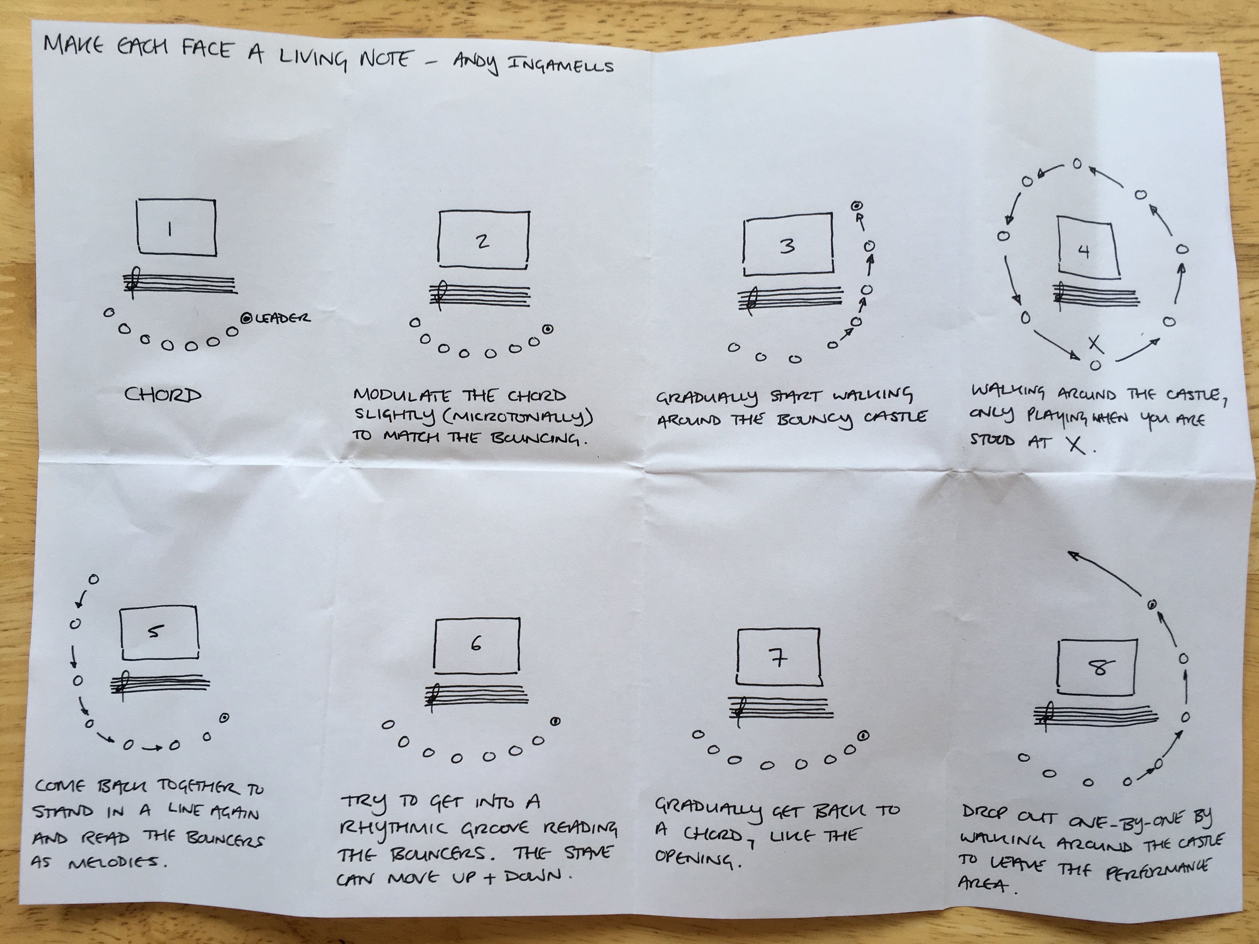 In Make each face a living note a large white bouncy castle is presented as though it is a musical score that is to be read and performed live in a participatory outdoor performance by an assembled group of brass players. The people bouncing on the bouncy castle, who could be considered the ‘audience’, are read as musical notation, and a 5-line musical stave is held in front of them using thick coloured rope. Passers-by are invited to become a unique part of an ever-changing musical score by bouncing on the castle as the musicians interpret their heads as musical notes in realtime. The event begins with a soloist, and gradually the other musicians join until the piece finishes with a full ensemble playing together, whilst two performers holding the 5-line stave move it up and down to suggest that the players should alter their register. By presenting the audience as the notation to be read by the players in real time the piece challenges the traditions of what a musical and choreographic performance can be.