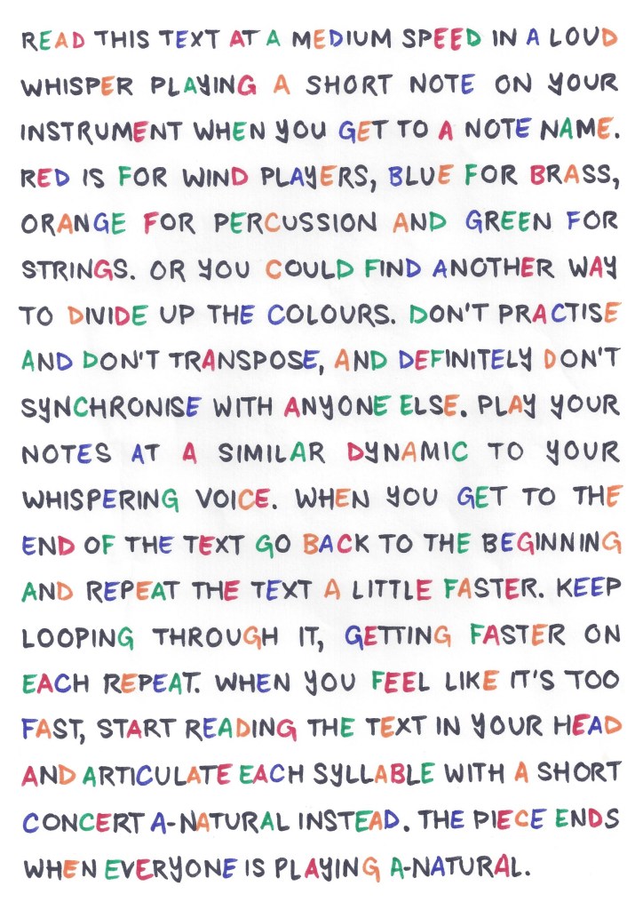 London Sinfonietta put out a request for pieces written on a postcard during April 2020 and this was my response. I think of this piece like a sculpture: a single idea that doesn’t change much, but that could be played in combination with other single-idea pieces that I’ve composed. These pieces exist almost like a gallery show in my head, where the listener could wander around occasionally paying attention if something struck them.