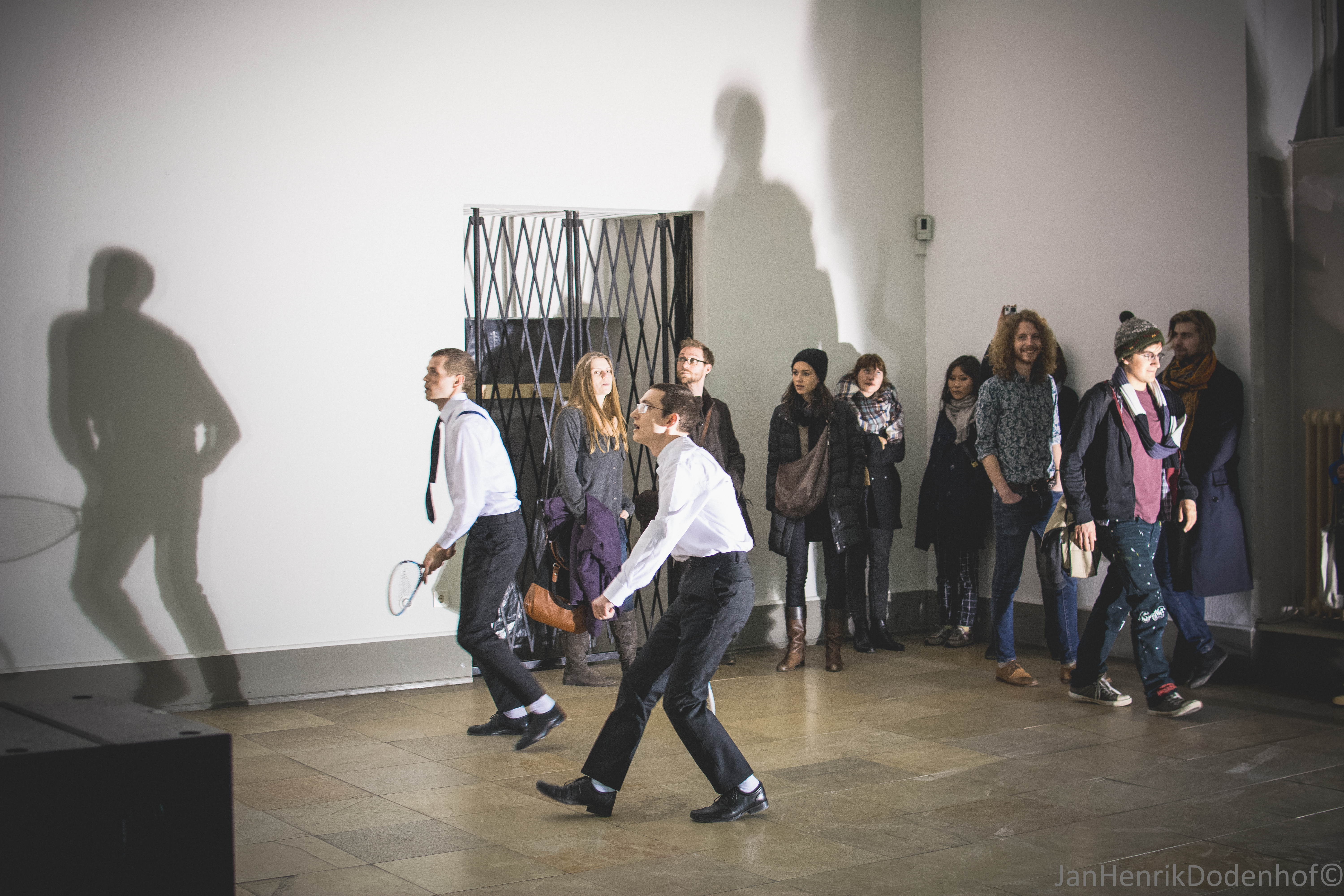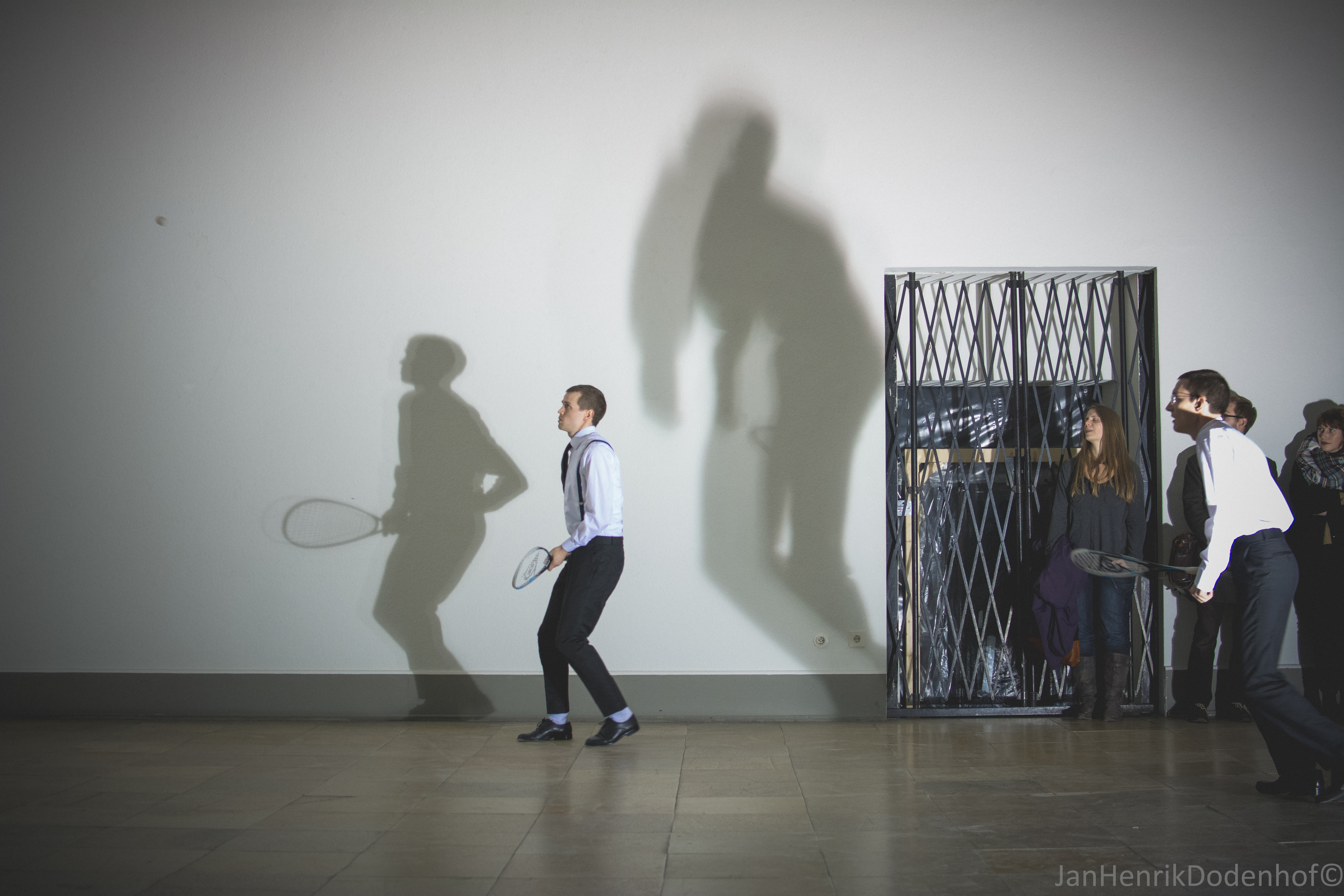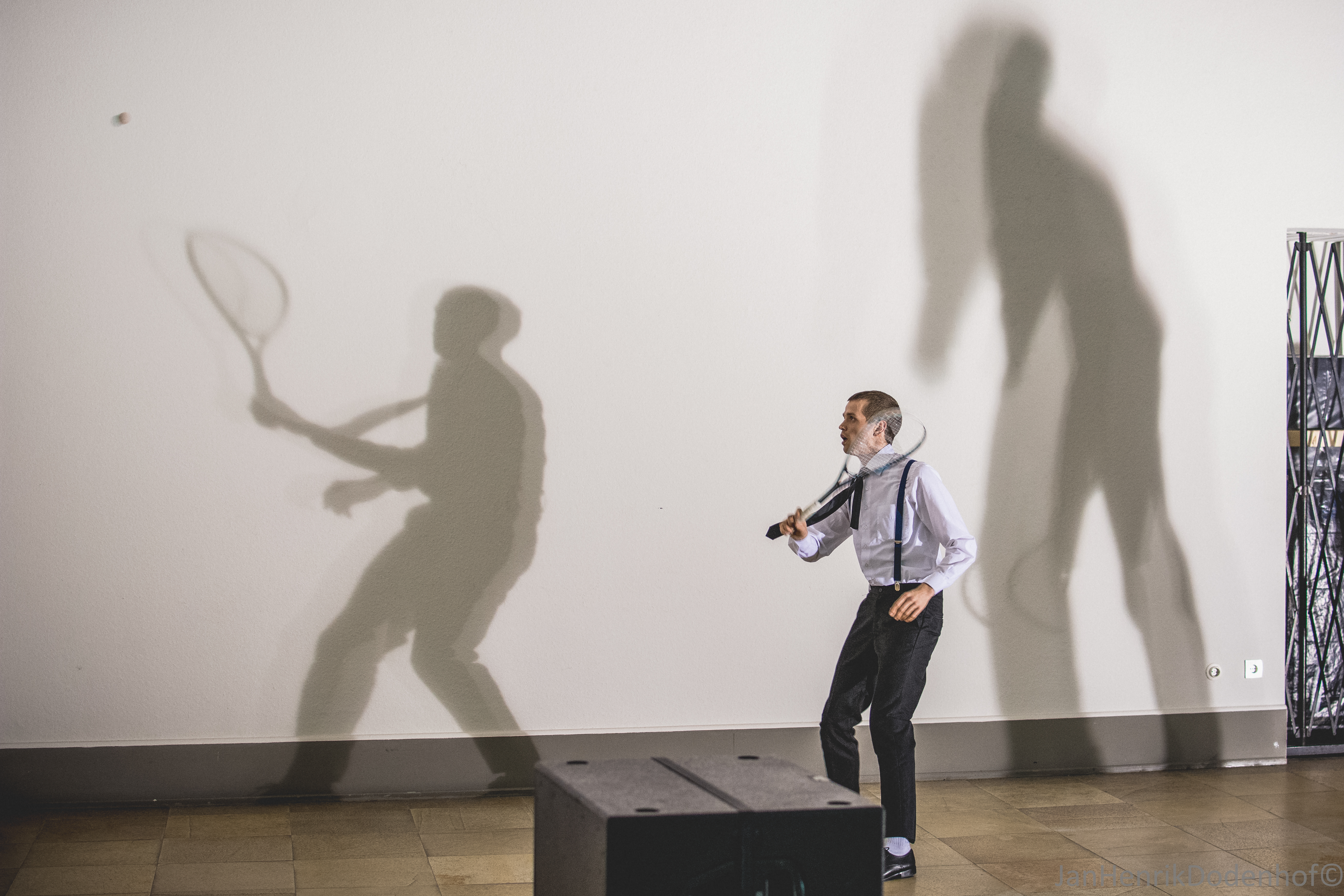 This piece was my contribution to a large-scale hour-long show made in collaboration with German theatre artists Ludwig Abraham and Daniel Verasson. It was conceived as a theatre piece specifically for the empty art museum in Marburg, Germany. It is about how talking about music can be made into a musical experience. I achieve this through the real-life percussive accompaniment of a squash game, emphasising how this leaves the players out of breath, thus breaking up their speech. An explanatory text highlights this point at the end of the piece, taking the maxim “talking about music is like dancing about architecture” as a point of departure. This line has been attributed to many different people including Laurie Anderson, Miles Davis, Frank Zappa, Clara Schumann, Elvis Costello, Steve Martin and Thelonious Monk. However blogger Garson O’Toole concludes on Quote Investigator that American comedian Martin Mull probably came up with it first (O’Toole, 2010).